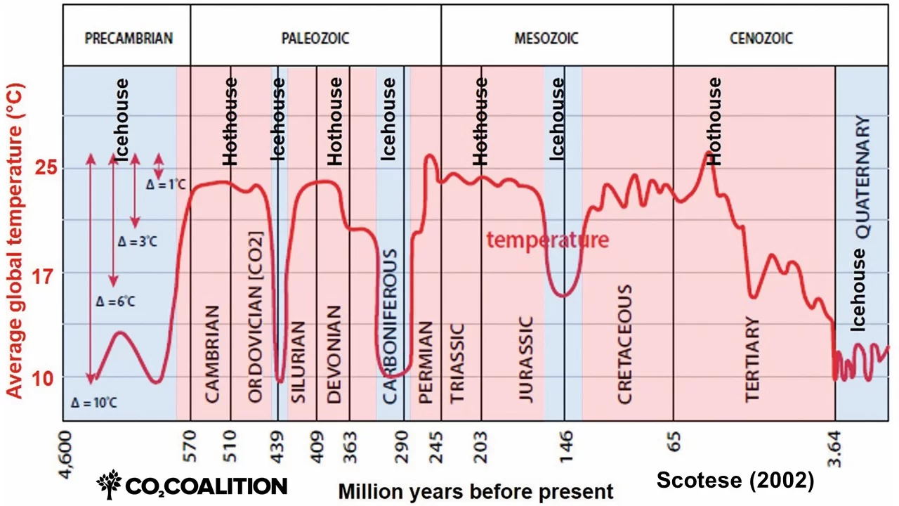 Jorda har vært varm før. For 200 millioner år siden (i Perm-Trias) var den 11C varmere enn i dag. I den 4. kvadranten i grafen ser vi istider der det skifter mellom -5C og 0C. 5 kvadrant viser vår mellomistid (Holocen). Grafen er en form for logaritmisk. 5 kv. viser 20.000 år, mens 1.kv. viser 500 millioner år.